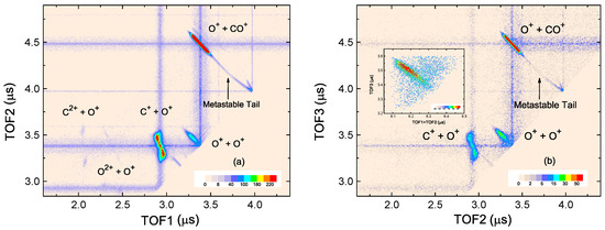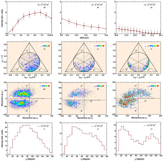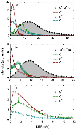 - Khan, A.; Tribedi, L.C.; Misra, D. Observation of a sequential process in charge-asymmetric dissociation of CO2q+(q=4,5) upon the impact of highly charged ions. Phys. Rev. A 2015, 92, 030701. [Google Scholar] [CrossRef]