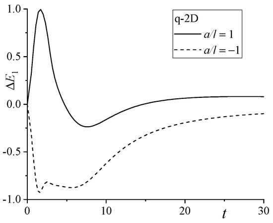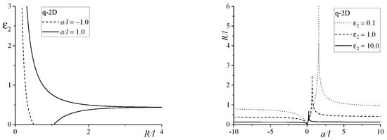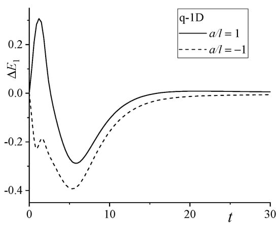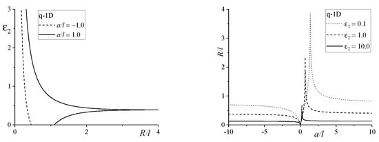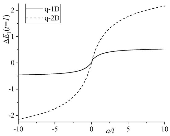 In Figure 3 we plotted a typical dependence of the correction to the internal energy, i.e., , of an ideal Bose gas caused by a single impurity as a function of the s-wave scattering length a in quasi-1D and quasi-2D geometries at temperature and at fixed densities of quasi-1D and quasi-2D Bose gases of and , respectively. It should be noted that in the case of an ideal Bose gas, the only physical region is , where there is no bound states formation. However, if we assume any weak repulsion between bosons with the coupling , the collapse of the system will be prevented. Indeed, the decrease of energy by due to the bound state formation of N bosons will be accompanied by its enormous increase by in quasi-1D and in quasi-2D, due to boson–boson interaction. Our calculations, therefore, can be extended to impurities immersed in Bose gas with any weak repulsion that does not considerably change the properties of Bose gas itself, but prevents the collapse on impurities. Although, the general behaviour of the curves is qualitatively the same, the spatial dimensionality affects the magnitude of the correction.