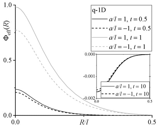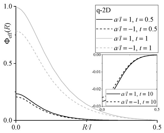 The results of the numerical calculations of for the quasi-1D and quasi-2D cases are presented in Figure 6 and Figure 7, respectively. Data are shown for two values of the scattering length and three temperatures. The physical region for an ideal Bose gas is again restricted to and large R. However, any weak inter-boson repulsion extends this region to arbitrary Rs and signs of a. Let us make two comments about the behaviour of . First, it is seen that in both quasi-1D and quasi-2D, the character of the curves is quantitatively similar for the same set of parameters, and visible discrepancies only appear in the high-temperature region, as shown by comparing the y axes of the insets in Figure 6 and Figure 7. In order to visualize this pattern, we plotted in Figure 8 at various temperatures. Secondly, as a function of temperature, the effective two-body potential changes its sign from repulsive at low temperatures to attractive in the high-temperature region.