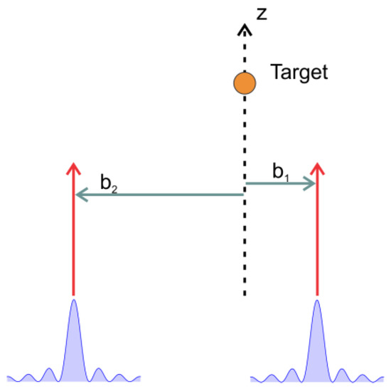 Schematic of incident Bessel projectile impinging on a target atom. Because the Bessel wave function is not uniform in the transverse direction and has a well-defined center of symmetry, an offset vector (or impact parameter) must be defined. Projectiles with two possible values of are shown (). The shaded blue region is the transverse profile of an incident Bessel projectile. The red arrows indicate the propagation direction of the incident projectile.