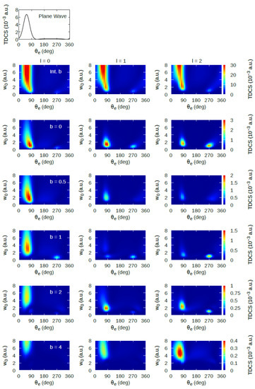 In rows two through seven in Figure 2, we present the TDCSs for LG projectiles with different beam waists, impact parameters, and orbital angular momenta. We note that the results for are qualitatively similar to those with and are not shown here. In Figure 2, the TDCS magnitude is presented in color, with the warmer colors representing larger TDCS values. The vertical axis in each panel shows the beam waist, while the horizontal axis depicts the ejected electron angle. The second row shows TDCSs integrated over the impact parameter, while rows three–seven show the TDCSs for a fixed impact parameter (labeled in the left column). For the TDCSs with a fixed impact parameter, we assume that the projectile center is shifted by a distance of b along the negative x-axis (i.e., ), and note that the TDCSs calculated for were identical to those for . For the TDCSs integrated over , all radial values and azimuthal angles were included in the integration. Each column shows the TDCSs for a different orbital angular momentum (labeled above row two).