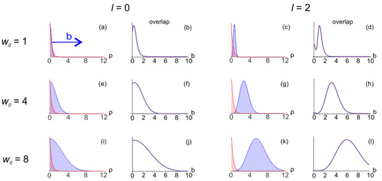 For off-center collisions and zero angular momentum (rows four–seven, column one in Figure 2), the maximum TDCS occurs with increasing beam waist as the impact parameter increases. For , the TDCS only becomes observable in the colormap plots for when the overlap between the beam profile and target electron density is non-negligible. Because the TDCS with a large impact parameter is observable only when the beam waist is large, the coherence length of the projectile is also necessarily large. This leads to a more plane wave-like TDCS shape, with the binary peak located at the momentum transfer direction. As the impact parameter increases, the overall magnitude of the TDCS decreases (see changing color scale for different rows), indicating that ionization becomes less likely for larger impact parameters. This correlates with the amount of overlap between the projectile and target electron density. Regardless of beam waist, the overlap decreases with increasing impact parameters (see Figure 3b,f,j).