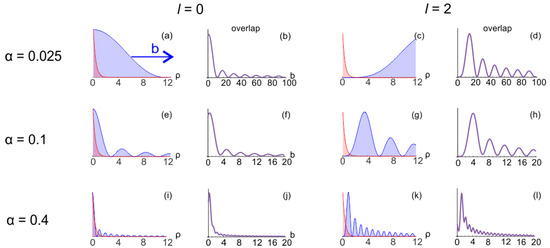 (a,e,i,c,g,k) Transverse profiles of the He(1s) electron density (red) and the LG beam (blue) with , orbital angular momentum l, and beam waist (in a.u.) as a function of transverse distance (in a.u.). All profiles are normalized to 1 to provide a qualitative comparison. The target atomic electron density is the same for all cases. As the impact parameter changes, the projectile beam shifts right, as denoted by the blue arrow in (a). (b,f,j,d,h,l) Normalized overlap between the transverse LG beam profile and the target atom electron density as a function of the impact parameter b (in a.u.) calculated using Equation (23).