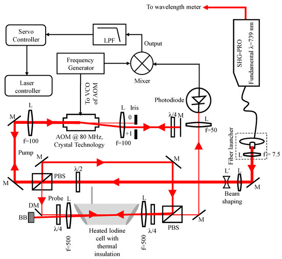 A schematic of the experimental setup for achieving SAS of iodine molecules is demonstrated in Figure 2. The frequency doubled laser system (TA-SHG Pro, Toptica, Munich, Germany) with 739.05 nm as its fundamental wavelength has three outputs. Of these, the 3 mW fundamental output is used for monitoring the laser’s wavelength using a commercial wavelength meter (WS7, High Finesse). The second fundamental output of power 30 mW is used for the SAS experiment and is split into probe (reflected part) and pump (transmitted part) beams using a polarizing beam splitter (PBS), as shown in Figure 2. A half waveplate after the PBS allows us to adjust the power distribution between the probe and pump beams. The probe beam entering the iodine cell is circularly polarized and the pump beam is passed through an AOM (R46080-1-LTD, Gooch & Housego, Ilminster, England) arranged in a double-pass configuration [41] and is operated at 80 MHz. This is used for frequency modulation of the pump beam as well as for fine-tuning its frequency in locked conditions. On passing twice the quarter waveplate placed behind AOM, the polarization of the pump beam changes and so while retracing back the path to PBS, it now gets reflected. The reflected pump beam is again passed through a combination of PBS and a quarter waveplate, it thus enters the iodine cell as a circularly polarized beam. The double-pass configuration exterminates the requirement of re-aligning the optics on varying operating frequencies of the AOM. As required by the MTS technique, the pump beam is frequency modulated at 60 kHz by feeding a sinusoidal wave to the home-made AOM driver [15]. The modulation frequency is chosen such that the error signal is obtained with a good S/N ratio. The power of the pump and probe beams are kept at a ratio of 10:1 and finally sent into the cell in a nearly counter-propagating direction with maximum relative overlapping.