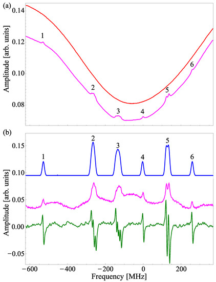 The output of the laser was scanned over a frequency range of ≈1 GHz from 739.0332 nm to 739.0349 nm to probe the R(78) (1–11) lines containing 15 components a1 to a15. Figure 3a shows the experimentally obtained Doppler-broadened signal in the absence of the pump beam and the SAS signal. For any comparison with the theoretically estimated signals, we used the program IodineSpec5 [42], which was developed by H. Knckel and E. Tiemann and based on iodine atlas [26,27,28,29,33,43,44,45,46,47,48]. The theoretically estimated Doppler-broadened signal at 450 °C has a full width at half maximum (FWHM) of ≈856 MHz and that obtained from our experiment is 903(3) MHz. Figure 3b depicts the hyperfine transitions as obtained from IodineSpec5 for the same wavelength range. For a better identification of the Doppler-free spectra and comparison with the theoretically estimated lines, the experimental Doppler-broadened signal was subtracted from the Doppler-free spectra, and the same is illustrated in Figure 3b. The analysis of the obtained spectra shows a total of six Doppler-free features of R(78) (1–11) line as labeled in the figure; their measured transition frequencies and FWHM are given in Table 1 and compared with those obtained from IodineSpec5. Additionally, all the observed peaks are in perfect alignment with their corresponding first derivatives in the lock signal. The experimental signals were obtained with 1 mW probe power and 10 mW pump power. As can be seen from the error signals in Figure 3b, the Doppler-free spectra 1, 4 and 6 are clearly distinct whereas spectra 2, 3 and 5 are results of not properly resolved four, four and three hyperfine peaks, respectively. The hyperfine lines for feature 3 are almost resolved, and three and two of them are resolved for peaks 2 and 5, respectively. The output of the diode laser can preferably be locked to any of the resolved peaks 1, 4 or 6 having an FWHM of 23(3) MHz, 21(2) MHz and 23(4) MHz, respectively, as compared to hundreds of MHz of a Doppler-broadened signal.
