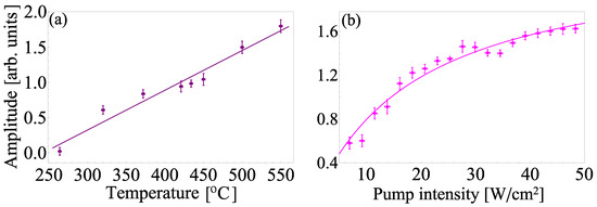 where A is a constant proportional to , which is the difference in population in the excited and ground states, I is the beam intensity, is the saturation intensity and is the resonant frequency [49]. At higher temperatures, more molecules are prepared in the excited state, meaning an increase in , and hence an increase in . A look at Equation (2) also implies that increased laser intensity will result in increased Doppler-free signal intensity. To analyze the same, we studied the effect of iodine cell temperature and pump beam intensity on the amplitude of the Doppler-free spectra and presented the variation in Figure 4. Keeping the pump and probe power fixed to 10 mW and 1 mW, respectively, the cell temperature was varied from 264 °C to 560 °C and the corresponding variation in amplitude of Doppler-free spectrum 4 was noted. On changing the cell temperature, measurements were recorded only after ensuring that thermal equilibrium has reached. The cell is not heated beyond 600 °C to avoid any damage. As is apparent from Figure 4a, the peak amplitude increases with the rise in temperature, which is obvious as increased temperature heavily populates the desired state with more iodine molecules. It is also quite clear from Figure 4a that at temperatures below 243 °C, the amplitude of the peaks is not high enough for them to be well resolved. Furthermore, keeping probe power fixed at 1 mW and cell temperature at 450 °C, the pump power is varied and the corresponding observation is shown in Figure 4b from which we infer that the peak amplitude of the Doppler-free feature increases with an increase in pump beam power. This occurs because increased pump power implies increased intensity within the Rayleigh range, and hence, better interaction with the iodine molecules within that spatial range. If and are the light scattered from the population in the excited state and saturation intensity of the corresponding signal, respectively, then we have,