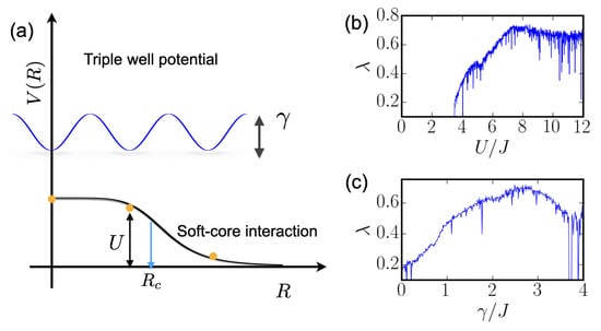 Existing studies have focused on static and dynamical properties of Rydberg-dressed atoms confined in traps [,,,,,,] and optical lattices [,,,,,,,]. Interaction effects due to the Rydberg dressing have been experimentally demonstrated in optical tweezers [], optical lattices [,,] and harmonic traps []. In optical lattice potentials, such a large soft-core radius is typically much larger than the lattice spacing, as depicted in Figure 1a. The dynamics of Rydberg-dressed bosons are described by an EBHM []. In Refs. [,], we studied nonlinear and chaotic dynamics of Rydberg-dressed bosons in finite potential wells in the semiclassical regime. In the quantum regime, it is known that the BHM is non-integrable in general, where quantum chaos can be triggered by the competition between coherent hopping and on-site interactions [,,,,]. In the presence of long-range interactions, it has been shown that quantum chaos emerges in EBHMs realized with dipolar bosons, which feature nearest-neighbor interactions [,]. The respective chaotic properties are characterized by quantities such as level statistics [], Shannon entropy, and survival probabilities of the initial state [].