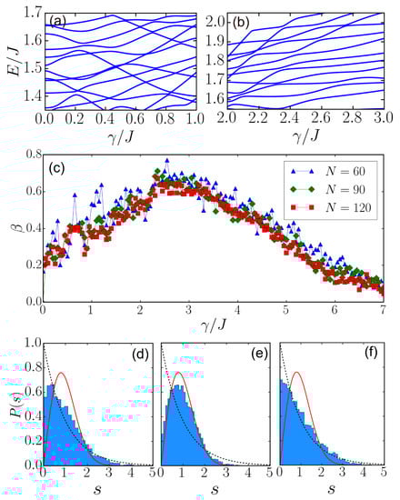 To understand the different behaviors of the eigen-energies, we analyzed statistics of the nearest-neighbor spacing s between energy levels. The probability distribution of the spacing s can be used to distinguish integrable and chaotic dynamics []. For integrable systems, follows the Poissonian distribution,