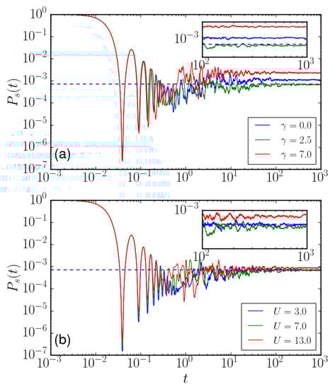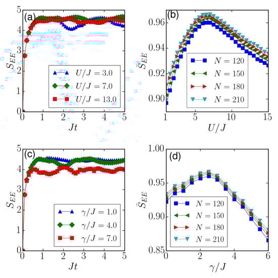 In Figure 4a, the dynamical evolution of is shown for , and , with initial state and . The entropy initially increases monotonically for a short period of time and then fluctuates around a constant value with small amplitudes. Here, the saturation values of depend on . If one increases U, amplitudes of the fluctuation will be further reduced. To explore the dependence of the entropy on parameters, we numerically calculated time-averaged and normalized entanglement entropy, , where . The normalization could partially eliminate the dependence of on N. In the numerical calculation, we chose to avoid the influence due to the initial stage of the entropy. We set in calculations, as saturates when . It is important to note that long-time behaviors of are independent of the initial configurations, though details of the dynamics depend on the configuration. By focusing on initially, we can compare dynamics of various parameters. This is particularly useful when .