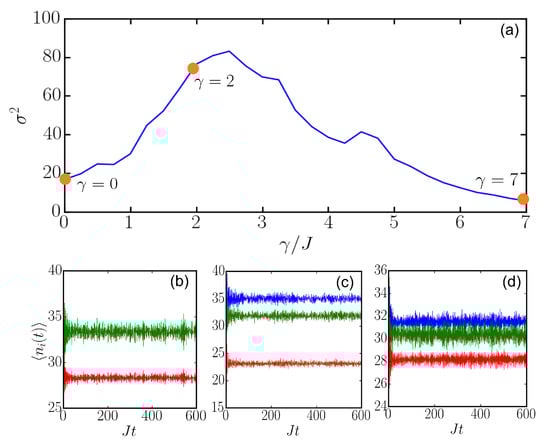 We numerically evaluated population in the i-th site with initial state . The time-averaged variance of the populations in the three wells is defined as