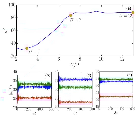 where . Figure 6 shows dependences of the variance on and with . Here, first increases, gains a peak value at around and then decreases with an increasing . This dependence is similar to that of the Lyapunov exponent, i.e., Figure 1c, chaos indicator, i.e., Figure 3c, and entanglement entropy, i.e., Figure 5d. Hence, the similar profiles indicate that one could measure the variance to identify chaotic dynamics. Furthermore, we show the variance as a function of in Figure 7. We find that the variance first increases with an increasing and then saturates at around 90. Hence, the variance becomes insensitive if we further increase U. This could be attributed to the fact that strong interactions suppress hopping and hence reduce the population variance. Though the profile is different from other chaos indicators in this case, we notice that the saturation starts from . This corresponds to the parameter where other chaos indicators arrive at their maximal values.