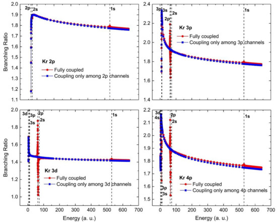 - Munasinghe, C.R.; Deshmukh, P.C.; Manson, S.T. Photoionization branching ratios of spin-orbit doublets far above thresholds: Interchannel and relativistic effects in the noble gases. Phys. Rev. A 2022, 106, 013102. [Google Scholar] [CrossRef]