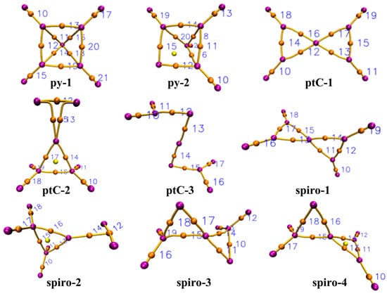 Initially, we designed 13 possible geometries of molecular formula C5H4 consisting of three pyramidanes, five ptCs, and five spiro molecules (Figure S1). These structures were subjected to geometry optimization using DFT at the B3LYP [51,52] /6-311+G(d,p) [53,54] level of theory without applying any geometrical or symmetry constraints. Some initial structures did not converge to the desired geometry; however, after multiple trials we could optimize two pyramidanes, three ptCs, and four spiro structures. These optimized structures were then subjected to frequency calculation to check the number of imaginary frequencies (NImag) and to ascertain whether the isomer is a minimum or higher-order saddle point or transition state on the C5H4 PES.