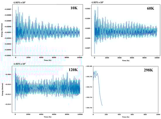 The ab initio molecular dynamics simulations (AIMD) [68] have been carried out for all nine isomers at different temperatures to confirm their kinetic stability in their respective singlet ground electronic states. Atom-centered density matrix propagation (ADMP) is an extended Lagrangian molecular dynamics method which has been used to employ the atom-centered Gaussian basis functions and one-particle density matrix propagation. These simulations were executed in Gaussian 09 software at 1 atm pressure and temperatures of 10 K, 60 K, 120 K, and 29 8 K for 10,000 fs at the B3LYP/6-311+G(d,p) level of theory. The time evolution of the total energy of the minimum energy ptC isomer (ptC-2) at different temperatures is shown in Figure 5. AIMD results for other isomers at different temperatures are shown in the Supporting Information.
