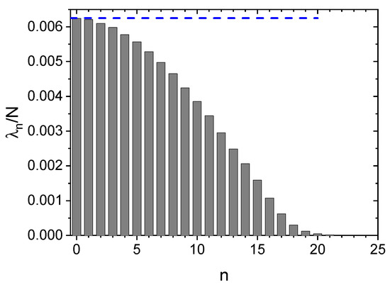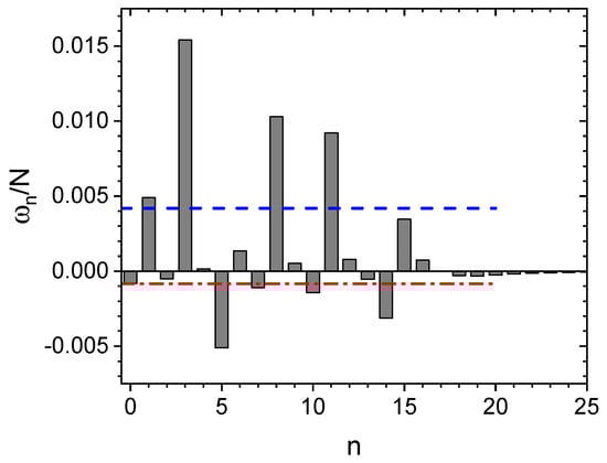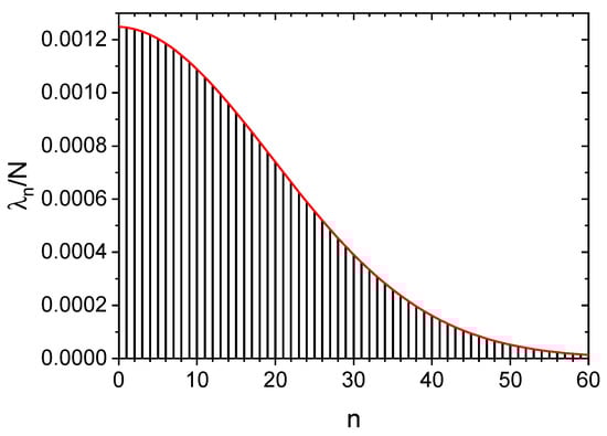 The spectrum can be treated as a continuum, with (where ). Figure 6 shows the discrete values vs. n for from Equation (40) (columns) and its continuous approximation (41) (red continuous line).