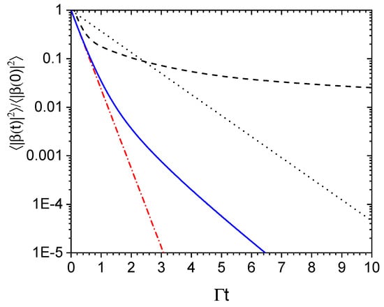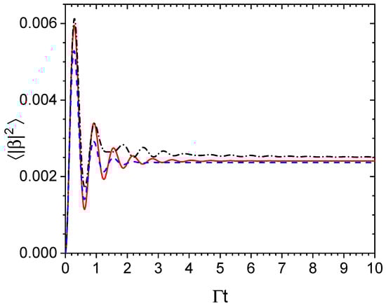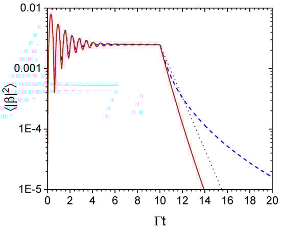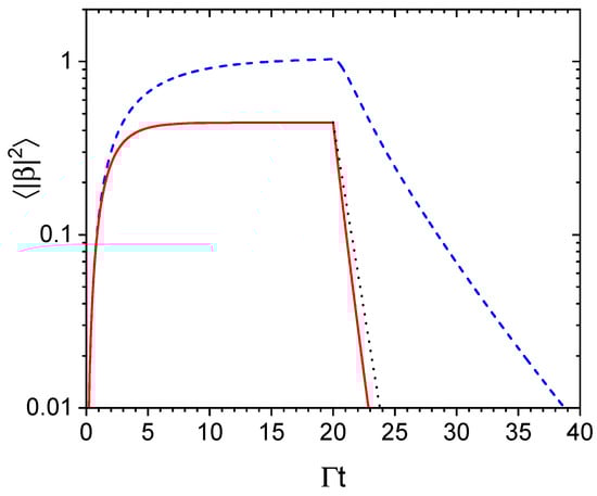 Figure 3 shows the average excitation probability vs. for , and : the continuous red line is the MF solution, obtained from Equation (31), whereas the dash black line is the numerical solution of Equation (1). The timed-Dicke approximated solution [13,14,29,30] can be obtained by assuming , giving
