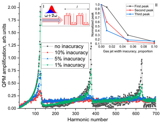 To investigate the influence of the accuracy of determining the geometric dimensions of the MJGM, calculations of the spectra of the QPM amplification in the MJGM were carried out with variations of d1, which was set within the range (0, 0.1 d). For this study, f was chosen as a set for a random variable defined within (−0.5, 0.5) and changed its value when each MJGM jet was formed. Figure 1 shows the spectra of the QPM amplification in the MJGM calculated for d1 = 0 (black curve with squares), d1 = 0.01 d (green curve with inverse triangles), d1 = 0.05 d (blue curve with triangles), and d1 = 0.1 d (red curve with circles). It can be seen that with accurate jet width determination, a sequence of amplification peaks can be observed in the spectrum [24,25]. However, inaccurate jet width determination primarily affects the efficiency of higher-frequency QPM amplification peaks. Thus, at d1 = 0.01 d, the efficiency of the first QPM amplification peak decreases by 5%, while the amplitude of the second and third QPM amplification peaks decreases to 60% and 40%, respectively. Further increasing the value of d1 leads to a more significant decrease in all QPM amplification peaks (see inset of Figure 1). Apparently, such a high sensitivity of the QPM amplification efficiency to the accuracy of determining and regulating the widths of gas jets is an obstacle to experimental confirmation of the presence of the high-frequency QPM amplification peaks.