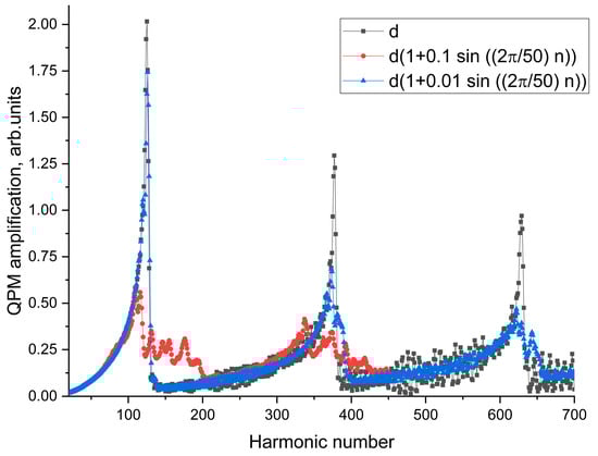 The conducted research, in which a linear, quadratic, exponential, and sinusoidal function of the order number of the gas jet was used as f, allowed us to calculate the response of the MJGM with changing geometric dimensions of the gas jets according to the specified law when transitioning from jet to jet. However, this did not reveal any new possibilities for increasing the efficiency of the QPM amplification compared to the regular determination of jet sizes. Nevertheless, it should be noted that when sinusoidally changing the widths of the gas jets with an amplitude of d1 = 0.1 d, an increase in the width of the first QPM amplification peak is observed with a simultaneous four-fold reduction in the total amplitude (see the red curve with circles in Figure 2). Amplification of a relatively large group of harmonics can be useful in the creation of attosecond pulses. In the calculations carried out, it was assumed that f = sin((2π/50)∙n), where n is the order number (index) of the gas jet in the medium (variates from 1 to 50).