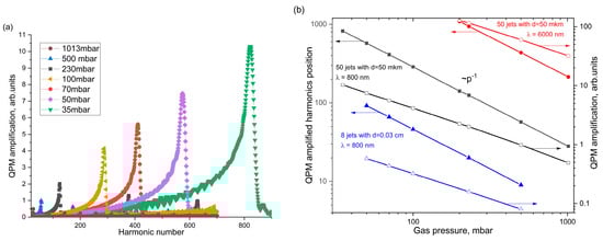 To demonstrate this, calculations for the MJGM with d = 50 mkm interacting with the two-color laser field formed by the fundamental and the second harmonics of the mid-IR laser (λ = 6000 nm; other parameters of the laser field, such as the values of two-color laser field components and the number of the field’s oscillations inside the temporal envelope coincide with the one for the Ti:Sa laser) were carried out (see the red curves in Figure 3b). It was demonstrated that both the position of the QPM-amplified harmonics and the value of QPM amplification are inversely proportional to the value of the gas pressure.