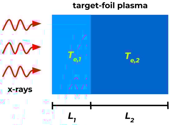 We hypothesize a simple, three-parameter schema for the electron temperature profile across the target-foil plasma. The model parameters are two temperatures, and , in conjunction with the length ratio , where represents the length of the interval in which the temperature is assumed to be constant and equal to (see Figure 3). In essence, we investigate the likelihood of a thin, hot layer on the pinch-facing side of the target-foil plasma. Preliminary work with prismspect, using the more general case of 10 temperatures, predicted a best-fit temperature profile with these characteristics. However, because this may be an artifact of a time-varying temperature, we are motivated to perform the more careful analysis herein. To best reproduce the experimental conditions, we demand that the total length conforms to the measured size of the NaFMgO layer, thus Å [10].