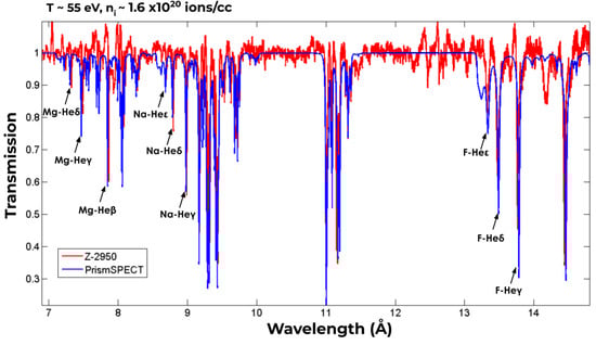 Comparison of transmission vs. wavelength for post-processed experimental data (red) and output of prismspect (blue), using inputs of eV and ions/cc. Notable K-shell transitions are labeled for magnesium, sodium, and fluorine.