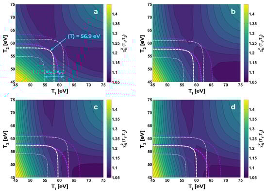 Contour plot of reduced statistic for (a), 2 (b), 3 (c), 4 (d). Thick curves represent the solution of (5) for eV (magenta dash-dotted) and eV (white dashed); thinner curves bound the range of uncertainty. Notice that shrinking the thin layer (i.e., increasing ) enhances correspondence between curves of eV and minimum .