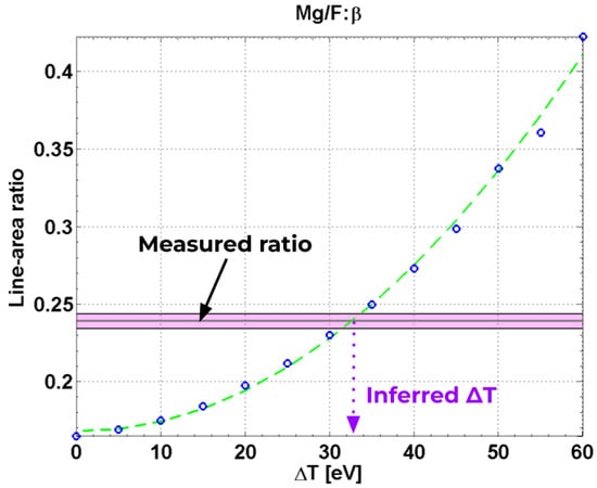 Quadratic regression analysis of the isoelectronic Mg He-/F He- line-area ratio vs. . Best-fit line is shown in green, while data derived from prismspect are shown as blue circles. Measured ratio from experiment is shown as a horizontal line; shading around this line represents the standard error ().