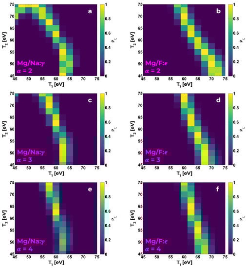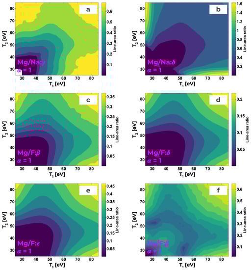 Contour plot of line-area ratio for Mg He-/Na He- (a), Mg He-/Na He- (b), Mg He-/F He- (c), Mg He-/F He- (d), Mg He-/F He- (e), Na He-/F He- (f). Note that these are taken from a symmetric simulation ().