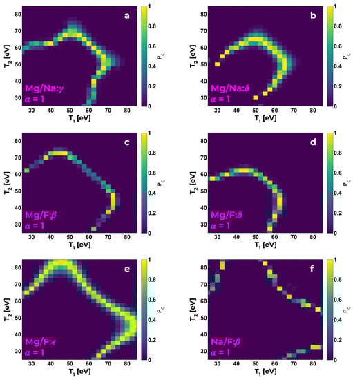 Visualization of , using (9), for Mg He-/Na He- (a), Mg He-/Na He- (b), Mg He-/F He- (c), Mg He-/F He- (d), Mg He-/F He- (e), Na He-/F He- (f). Conspicuous symmetry across is due to .