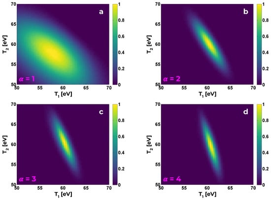 Convolutions of distributions , normalized by maximum value, for length ratios (a), 2 (b), 3 (c), 4 (d). Axes have been scaled by the number of contributing ratios to provide an estimate of the mean distribution. The tuple of the best-fit temperature profile is found where the distribution peaks; uncertainty is proportional to the full-width at half-maximum (FWHM). Domain has again changed to accommodate available temperature range.