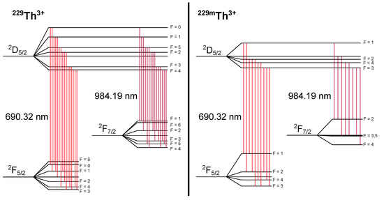 The radiative lifetime of the isomeric state is planned to be measured using hyperfine structure spectroscopy (HFS) at nm and nm to target the 2F5/2 → 6p 2D5/2 and 2F7/2→ 6p 2D5/2 transitions in 229/229mTh3+ [23] with natural linewidths of FWHM = 28 kHz and FWHM = 210 kHz, respectively [28]. Depending on their respective nuclear state, the hyperfine splittings of thorium ions differ from each other by several MHz according to calculations on the basis of experimental results in [18,28] and also visible in the level scheme of Figure 1. One condition, however, to resolve the hyperfine structure of thorium and to spectrally distinguish between the isomeric state and the nuclear ground state is the cooling of trapped ions below 1 K.