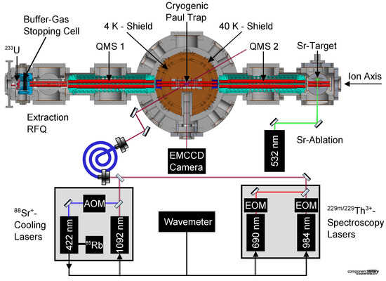 We expect to confine 50 to 100 229Th3+ ions in our Paul trap, thus statistically ending up with 1 or 2 of them in the isomeric state. For the efficient sympathetic cooling of such number of thorium ions, at least the same number of strontium ions is required. We can achieve this with the ablation of 88Sr+ from a solid-state target, similar to reports in the literature [33,34,35]. Our target material is a SrTiO3 crystal (Strontium Titanate Single Crystal Substrate <100>, 634689-1EA; Sigma Aldrich, Merck KGaA, Darmstadt, Germany) mounted at a distance of 610 mm from the Paul trap center behind QMS 2 (see Figure 3) in a room-temperature environment. Atom or ion ablation in close vicinity of a Paul trap under cryogenic conditions has been reported by several groups [29,34,36,37]. However, in these cases, surface ion traps with low numbers of loaded ions were mainly used. The aim for the efficient loading of potentially hundred and more strontium ions generated without additional photoionization lasers brought the decision to collimate and mass filter the ions before trapping. Furthermore, the direct ablation of ions from a solid target is a hardly quantitatively controllable process that generates a huge number of charged and neutral particles, which can coat the electrode surfaces. Therefore, ablation outside the cryogenic trapping region minimizes the risk of generating patch potentials on the trap electrodes, which in turn would have a negative influence on the motional heating rate or the position of the trapped ions [38,39,40,41].