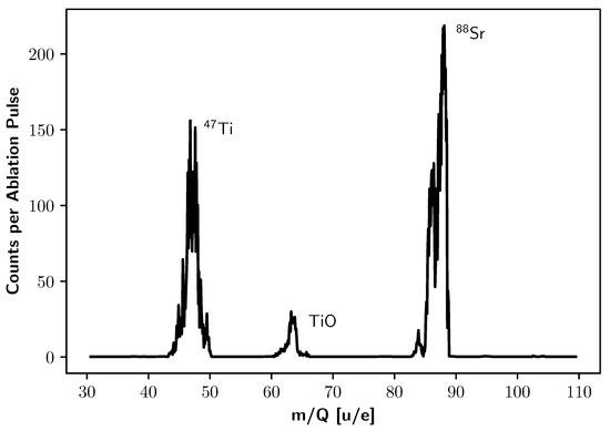 Mass scan obtained with QMS 2 of the ablated ion species from an SrTiO3 crystalline target. The ablation laser was run with a pulse energy of about mJ at a 5 Hz repetition rate. Visible are mass peaks at A = 47 (47Ti), A = 88 (88Sr), and A = 63 (TiO).
