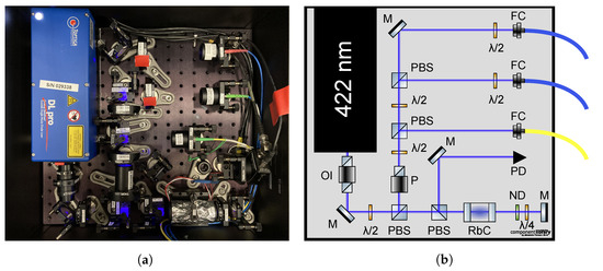 The 422 nm laser setup assembled in a rack drawer is depicted in a photograph (a) and for better visualization also as a schematic (b). The following abbreviations are used: M = mirror; OI = optical isolator; P = polarizer; λ/2 = half-wave plate; λ/4 = quarter-wave plate, ND = neutral density filter; PBS = polarizing beamsplitter; RbC = rubidium gas cell; FC = fiber coupler; PD = photodiode.