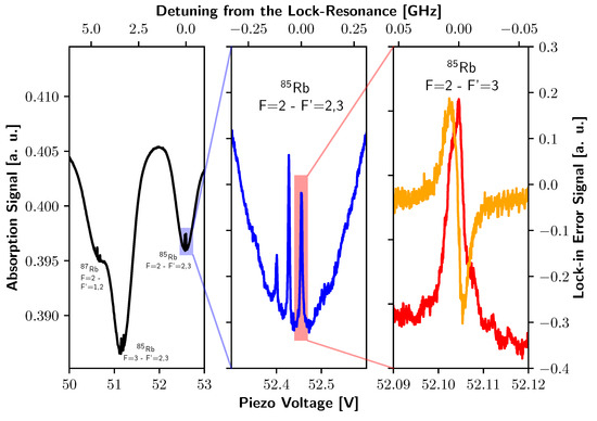 With a suitable heater and a controller (GCH25R, TC200; Thorlabs GmbH, Bergkirchen, Germany), the cell temperature is stabilized to 90 . The transmitted light then passes a quarter-wave plate and a neutral density filter (ND 0.5) before it is back-reflected through the setup up to the beamsplitter. In this way, the required probe beam for saturated absorption spectroscopy with turned polarization and lower intensity with respect to the initial pump beam is generated and reflected to a fixed-gain silicon photodetector (PDA8A2; Thorlabs GmbH, Bergkirchen, Germany). Feeding the detected signal directly to the digital laser controller (DLC pro; Toptica Photonics AG, Gräfelfing, Germany) enables the instant readout of the absorption signal in rubidium. Scanning the applied voltage of the piezo crystal, controlling the position of the grating with respect to the laser diode of the 422 nm laser, scanned the laser frequency and revealed the absorption spectrum of 85Rb/87Rb gas over the spectral range of interest, as shown in Figure 6.