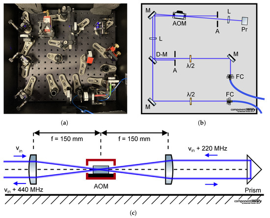 A detailed visualization of the AOM setup with a photograph of the respective rack drawer (a), a schematic top view (back-reflected second pass through the AOM partially not visible below the incident beam) (b), and a lateral view for a better understanding of the spatial separation of first and second passes (c). In the lateral schematic, the 0th and the +1st diffraction orders cannot be resolved. The following abbreviations were used: M = mirror; D-M = D-shaped mirror; L = lens; A = adjustable iris; FC = fiber coupler; Pr = prism; λ/2 = half-wave plate.