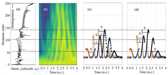 In the full-time Fourier transform, we obtain the complete spectral information of the harmonics, but the temporal information is lost. To detect further aspects of recollision dynamics, we perform the Gabor transformation for computing the time–frequency response (TFR) of the harmonic generation as [,,,,]