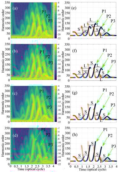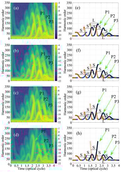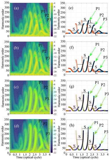 To understand the temporal development and investigate the dynamics in the half cycle, we have computed the time–frequency response of the dipole acceleration of the electron as shown in Figure 3 for inhomogeneity. The parameter varied as and in units of inverse of length in atomic units. The harmonics are generated in the falling edge of the pulse. The primary three recollision events are identified and marked as P1, P2, and P3 in the TFR maps corresponding to the three half optical cycles. These recollision events are also clearly identified in the classical solution of Newton’s second law for electron’s motion in the inhomogeneous field for the first recollision, consecutively marked as P1, P2, and P3. This also provides a cross verification of our computation. For the lowest value of inhomogeneity, the trajectories are more or less similar to the trajectories in the homogeneous driving, as shown in panels (a,e) of Figure 3, also compared with the HHG spectra for the homogeneous (black) and curves for (red). With this strength of inhomogeneity, the cutoffs are seen to have extended by a small amount. The truncation of the long trajectories are due to the absorption near the boundary (compare with the classical return picture in Figure 1d and Figure 3e). As we increase the strength of inhomogeneity, these half cycles fields become enhanced which increases the quiver radius () and subsequent gain in return kinetic energy (). Therefore the simple man model shows that with the increase of strength of inhomogenity, first the long trajectories and then the short trajectories would become absorbed near the boundary. This can be seen in the classical return picture in the panels (e–h) and in the quantum TFR maps in (a–d). With the increasing strength of inhomogeneity, the enhanced HCO due to the P1 and P2, i.e., cutoff and plateau, are broadened and eventually become nearly merged in the background at the highest value of the strength considered here. The enhancement near the threshold trajectory as marked with P3 in the panels are much robust with respect to the strength of inhomogeneity in the chosen parameter range.