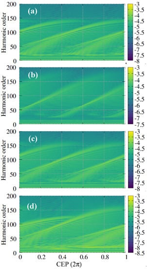 These HCO are highly sensitive to the carrier envelope phase of the driving laser pulse. In Figure 6, we have presented the complete panorama of the HHG spectra with respect to the CEP for homogeneous in (a) and for the inhomogeneities (b), (c) and (d) of Figure 6. The inhomogeneity parameters are taken as . With respect to the increase in CEP, the enhanced HCO in the lower-order harmonic region shifts towards the higher orders. This shift is nearly linear from near the above threshold to the mid-plateau region and becomes saturated in the near cutoff region. Furthermore, the harmonic spectra depends on the CEP with modulo- for the first three isotropic driving. In the inhomogeneity of type, the isotropy breaks and the spectra become modulo- periodic. This extension of periodicity increases the tunability of the enhanced HCO regions with respect to CEP in the latter case than that in the isotropic inhomogeneity or vice versa the retrieval of CEP using these HCO vs. CEP as the database []. One can further tune the HCO with the strength of inhomogeneity within a certain limit, as discussed above. The spectra and the HCO vary sensitively with respect to the length of the pulse. For a shorter pulse, the number of contributing half cycles decreases and for a longer pulse, the number of contributing half cycles increases and consecutive HCO start to overlap. How this spectra and half cycle harmonics modify in different types of inhomogeneity needs further investigation.