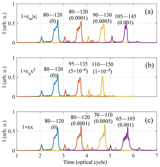 In the inhomogeneous driving, with the increasing strength of inhomogeneity, the extension of the cutoff is observed irrespective of the type of functional dependence. This extension of the cutoff is due to the gain in more kinetic energy while traveling in the enhanced inhomogeneous field compared to the homogeneous driving [,]. Also, with the increase of inhomogeneity, we can observe that the spectrum becomes more dense towards a quasicontinuum generation. For the asymmetric inhomogeneity, ref. [] showed that with a continuous wave laser even harmonics are produced due to the broken inversion symmetry, and with the increase of strength of inhomogeneity, the intensity of even harmonics become similar to that of the odd harmonics. Similarly, in the present calculation, we can see that the spectral intensity becomes flat over the spectral range as we have used a few cycle driving pulse. Furthermore, we can clearly see the extension of each half cycle of plateau harmonics, which is due to the corresponding enhancement of the electric field amplitude of the pulse in and types, but for x, we can see a different trend in the evolution of the mid-plateau HCO, which shifts towards the lower order with the increase of strength of inhomogeneity.