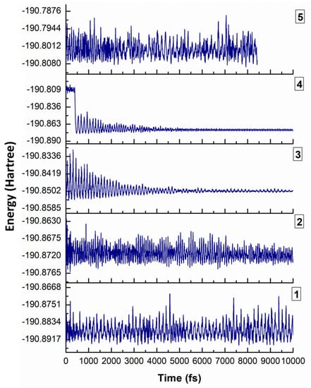 To confirm the kinetic stability of the neutral isomers of the molecular formula C5H, the ab initio molecular dynamics simulations were performed for all fourteen isomers at 298K temperature and 1 atm pressure condition at B3LYP/6-311+G(d,p) level of theory using Gaussian 09 software. The atom-centered density matrix propagation (ADMP) is basically an extended Lagrangian molecular dynamics method that has been used to employ the atom-centered Gaussian basis functions and one-particle density matrix propagation. These simulations were executed for 10,000 fs for the first five low-lying isomers and 2500 fs for the rest of the isomers. The time evolution of the total energy of the first five minimum energy isomers (1–5) at the given condition is described in Figure 7. AIMD results for other isomers (6–14) are shown in Figure S8 (Supplementary Materials). From Figure 7, it can be clearly predicted that isomers 1, 2, and 3 are kinetically the most stable isomers. ADMP study also reveals that isomer 4 isomerizes to 2, which can be verified through the isomerization process as the activation barrier is only 36 kJ mol−1. Isomer 6 converts to 3, and isomer 9 transforms to 5. Isomer 10 is kinetically unstable, and it isomerizes to 5, which can be verified from the rearrangement scheme as the activation energy for this isomerization is only 6 kJ mol−1. Similarly, isomer 11 is kinetically unstable as it converts to 5.