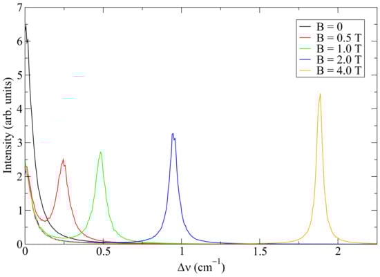 As an example, let us assume plasma conditions relevant to tokamak divertors. Specifically, the electron and ion temperature , the electron density , and the magnetic field B on the order of 1 T. A comparison of plasma-broadened Lyman- shapes in the presence of the magnetic field is given in Figure 1 (see Section 3 for the details of these calculations). It is seen that for a non-zero magnetic field, the widths of the and components of the Zeeman triplet are different, in agreement with the earlier findings []. Notably, as the magnetic-field strength increases, the Stark broadening of the central component remains nearly constant, whereas the lateral components become narrower.