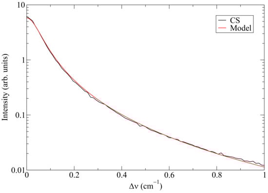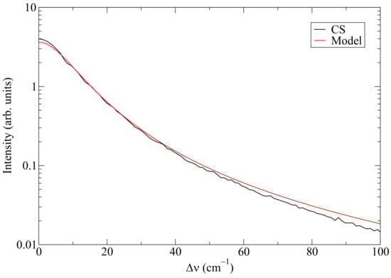 In white dwarf atmospheres, the magnetic field can easily reach hundreds of teslas, e.g., see [], with the electron density about to []. In Figure 3, a comparison under such conditions is shown. As in the previous example, a good agreement is seen. In both examples, the values of the full width at half maximum (FWHM) of the lineshapes differ by ∼15%.