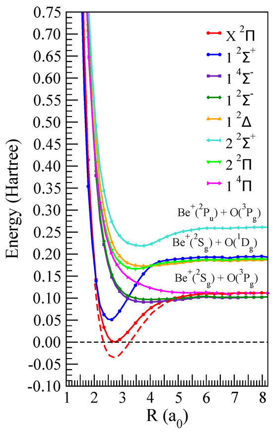 Potential energy of the ground and few excited states of the BeO molecular ion. Curves with symbols: present calculation. Bottom−most dashed curve: X ground state of Ghalila et al. [8] shifted down by 0.035 Hartree (≈0.95 eV).