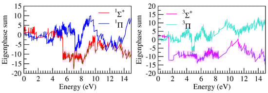 Typical eigenphase sums for , (left panel) and , (right panel) overall symmetries of the e + BeO system.