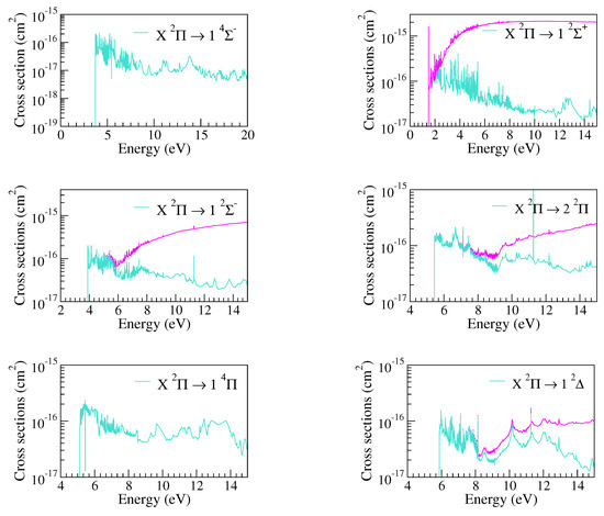(Left panels): cross-sections for electron impact excitation of the BeO molecule from its X ground state to the states indicated in the figures and dissociating to the Be(S) + O(P) limit. (Right panels): the same as left panels, but for states dissociating to the Be(S) + O(D) limit. The Born correction to the cross−section, wherever relevant, is given by the topmost curve (magenta, color online).