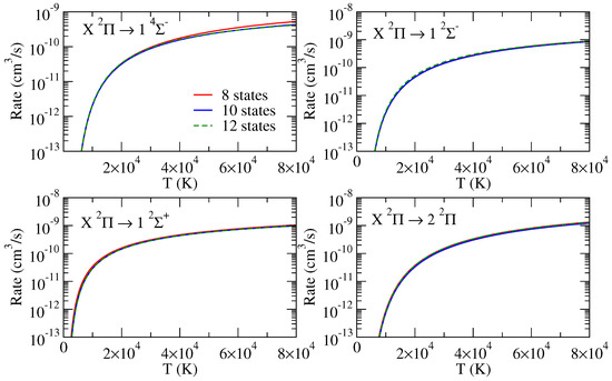 In Figure 4, we displayed the rate coefficients computed from the cross-sections for excitation from the X ground state to the first two states dissociating to the Be(S) + O(P) and the Be(S) + O(D) limits, computed in the 8-, 10- and 12-state models. The rate coefficients, presented in the electron temperature range of 0–80,000 K which correspond approximately to the incident energy range of 0–8 eV, are obtained with the aim of demonstrating convergence and hence are computed from the original cross-sections rather than the Born-corrected ones. It is clear from Figure 4 that, in all cases, convergence is obtained in the 10-state model and an additional calculation in the 12-state model confirms this.
