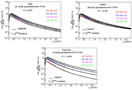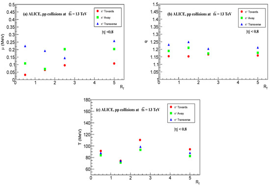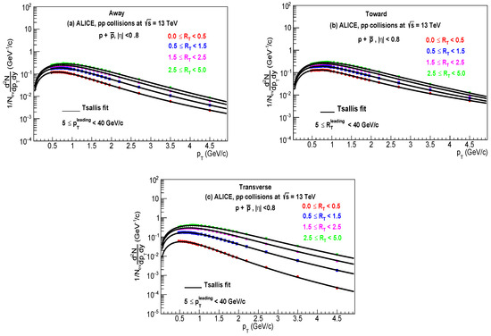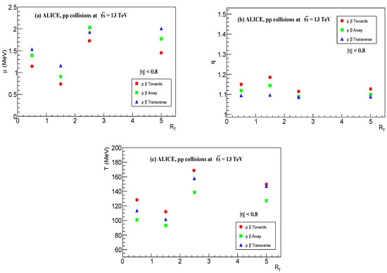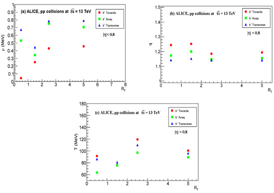 Figure 3a–c shows the particle yield as a function of relative transverse momentum classifier for primary charged particles like produced in high energy collisions at fitted with a thermodynamically consistent Tsallis distribution function with chemical potential . The observables reported are measured in three different topological regions: away, towards, and transverse. The circles display the experimental data in the pseudorapidity range of used in this analysis at LHC by ALICE collaborations [2]. The curve represents the fitting of the data by using Equation (3); the values of extracted parameters, Tsallis temperature, radius, non-extensive parameter () and are presented in Table 3.