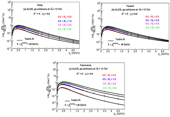 Figure 2a–c presents the particle yield as a function of relative transverse momentum classifier for strange particles like produced in high-energy collisions at fitted with a thermodynamically consistent Tsallis distribution function with chemical potential . The observables reported are measured in three different topological regions: away, towards, and transverse. The circles display the experimental data in the pseudorapidity range of used in this analysis at LHC by ALICE collaborations [2]. The curve represents the fitting of the data by using Equation (3); the values of extracted parameters, Tsallis temperature, radius, non-extensive parameter () and are presented in Table 2.