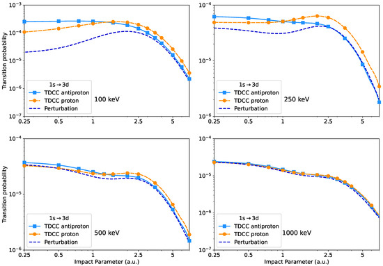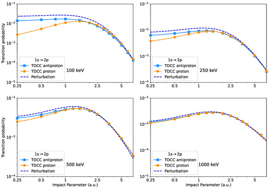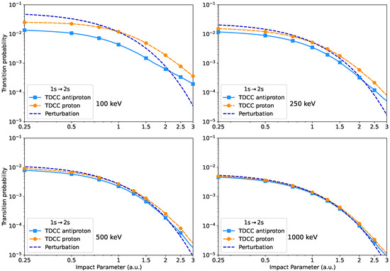 The excitation probabilities calculated using the TDCC and the perturbational method are shown in Figure 3. Similarly to the previous cases, for a 1000 keV projectile energy the transition probabilities are practically the same for protons and antiprotons, and the first-order approximation reproduces the TDCC results well. For lower-impact energies, the TDCC method leads to higher excitation probabilities for antiprotons below the impact parameter than for proton projectiles, and higher transition probabilities for protons at larger impact parameters. The perturbational method underestimates the results especially for small impact parameters, and at 100 and 250 keV projectile energies.